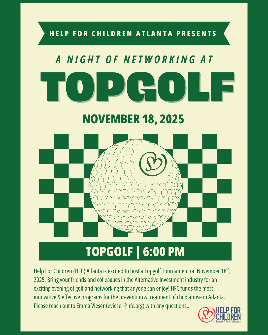 Practice your swing! HFC Atlanta is hosting a Networking Night at TopGolf on November 18th. Gather your colleagues and clients in the Alternative Investment industry and see who can drive home a win. Not the best golfer? Not a problem! HFC Atlanta's Networking Night will be hosted at TopGolf, meaning that anyone can pick up a club and support our mission.